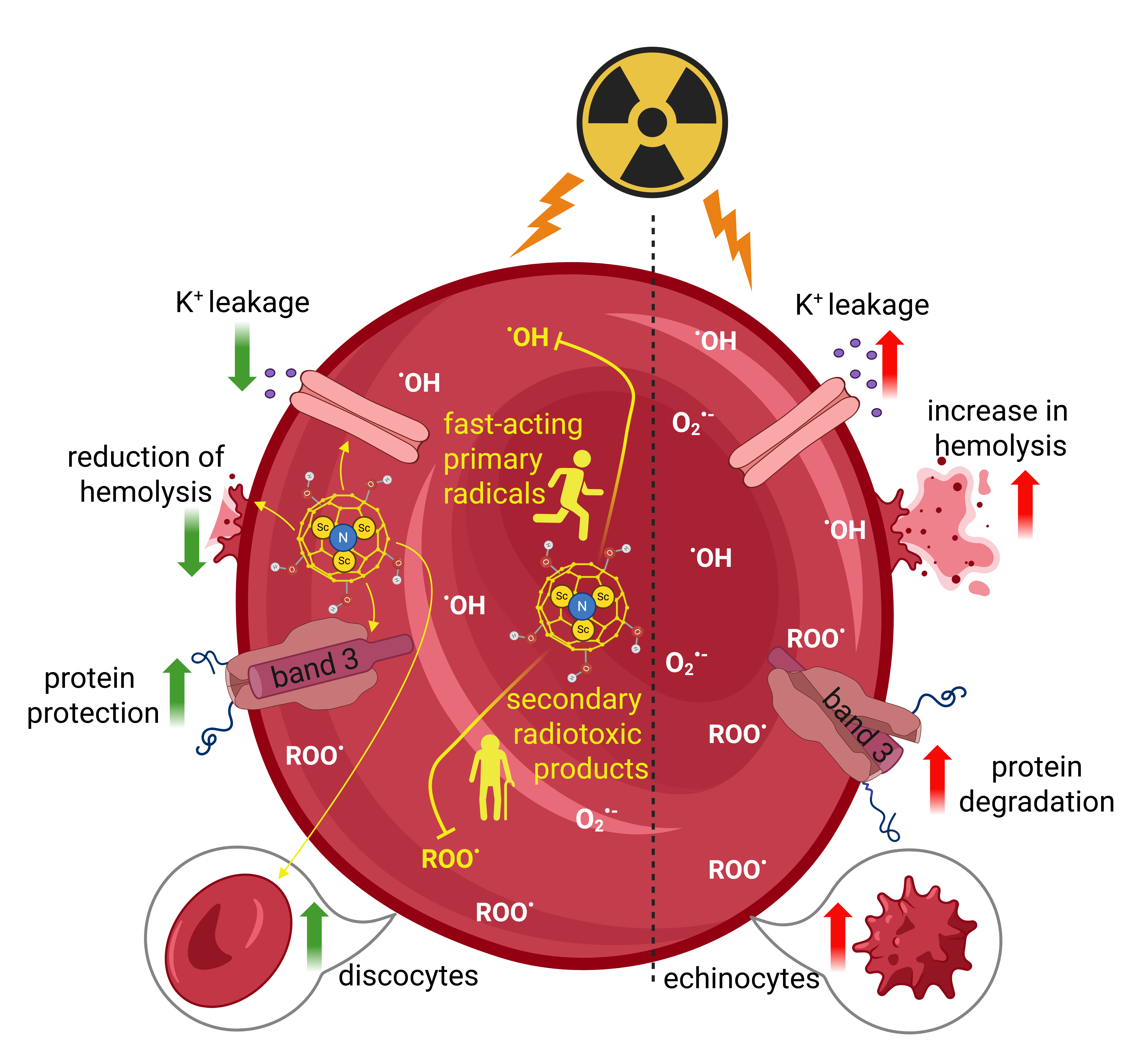 Metallofullerenols (MFs), functionalized endohedral fullerenes, combine atomic, molecular, and supramolecular features, offering unique antioxidant properties for radioprotection. This study focuses on Sc₃N@C₈₀(OH)₁₈ and its interaction with high-energy radiation and reactive oxygen species (ROS). Preclinical tests confirm its low toxicity and high efficiency as a redox mediator. The compound protects human erythrocytes from γ-radiation-induced hemolysis, reducing membrane protein degradation up to 2.1 kGy. Pulse radiolysis shows a rate constant of 1.29 × 10⁷ dm³ mol⁻¹ s⁻¹ for its reaction with CCl₃OO• radicals. These results suggest that ROS scavenging and membrane interaction underlie its radioprotective effect, highlighting Sc₃N@C₈₀(OH)₁₈ as a promising candidate for applications in cancer therapy and nuclear safety.