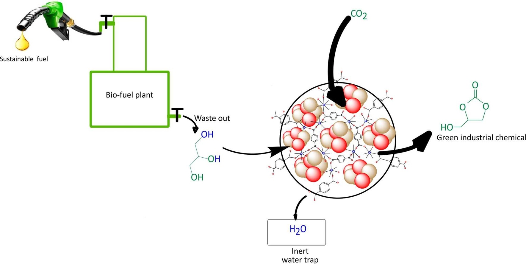 This publication presents a green and scalable approach for synthesizing and encapsulating clean metal nanoclusters (NCats) inside cerium-based metal–organic frameworks (Ce-MOFs) for the efficient carboxylation of glycerol with CO₂. In the pursuit of CO₂-neutral renewable energy solutions, biodiesel production generates large amounts of crude glycerol (GL) as a byproduct. Converting GL into value-added chemicals offers a sustainable route for its utilization. Metal nanoclusters embedded within MOFs represent a promising class of catalysts for such transformations, though their scalable synthesis has remained challenging. This study provides a clean, surfactant-free, and scalable method for producing Cu, Ag, Pd, and multimetallic PdAgCu nanoclusters within cerium-based MOFs, highlighting their potential for sustainable catalytic applications and CO₂ valorization.