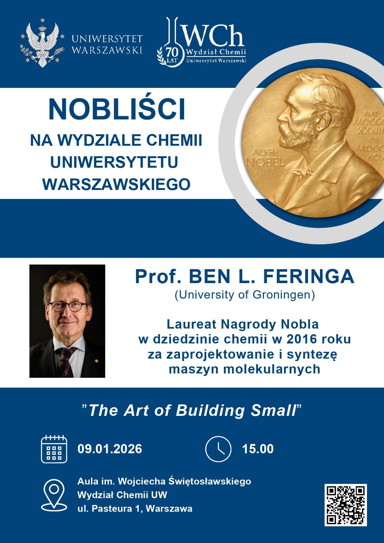 On January 9th at 3:00 PM, Prof. Ben L. FeringaNobel Laureate in Chemistry — will give a lecture titled “The Art of Building Small” in the main auditorium of the Faculty of Chemistry at the University of Warsaw.